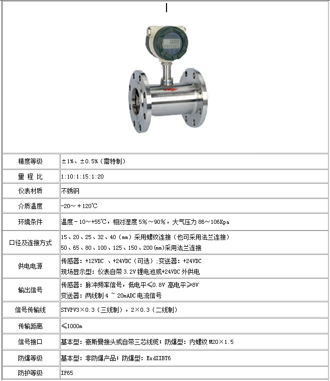 YSD500系列渦輪流量計,具有結(jié)構(gòu)簡單、反應(yīng)靈敏、精度高、輕巧、安裝維護(hù)使用方便等特點(diǎn),該產(chǎn)品廣泛用于冶金、化工、石油、城建、環(huán)保、食品等領(lǐng)域,高精度測量水、自來水、柴油、汽油和較低粘度原油等液體的體積流量。工作溫度下運(yùn)動粘度小于5×10-6m2/s的液體,對于運(yùn)動粘度大于5×10-6m2/s的液體,可對流量計進(jìn)行實(shí)液標(biāo)定后使用。若與具有特殊功能的顯示儀表配套,還可以進(jìn)行定量控制、超量報警等,是流量計量和節(jié)能的理想工具。